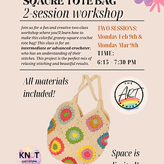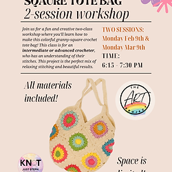 Granny Square Crochet Tote Workshop **All Materials Included** Two-Part Workshop • Limited to 6 Participants Class 1: Monday, February 9th • 6:15–7:30PM Class 2: Monday, March 9th • 6:15–7:30PM Join us at The ART Project for a fun and creative two-class crochet workshop where you’ll learn how to make a colorful granny-square crochet tote bag! 🧶✨ This class is perfect for intermediate to advanced crocheters who already have a good understanding of basic stitches and are ready to take their skills to the next level. This project is the perfect blend of relaxing stitching and beautiful, functional results! 🧵 Class 1: Learn the Squares We’ll walk step-by-step through creating the featured granny square, covering: How to read a crochet pattern How to create the center circle How to work through each colorful round Tips for keeping your squares neat, even, and ready for assembly Once you’ve mastered the square, you’ll take your kit home to crochet the remaining squares at your own pace. 🧶 Class 2: Assemble Your Tote Bring your completed squares back for assembly! You’ll learn: How to join squares so the bag lays flat and sturdy Techniques for crocheting or stitching seams How to attach and reinforce handles Finishing touches to make your tote polished and professional By the end of the workshop, you’ll have a handmade crochet tote bag that’s colorful, durable, and totally unique—crafted by you! ✨ Space is limited to 6 participants—reserve your spot early!